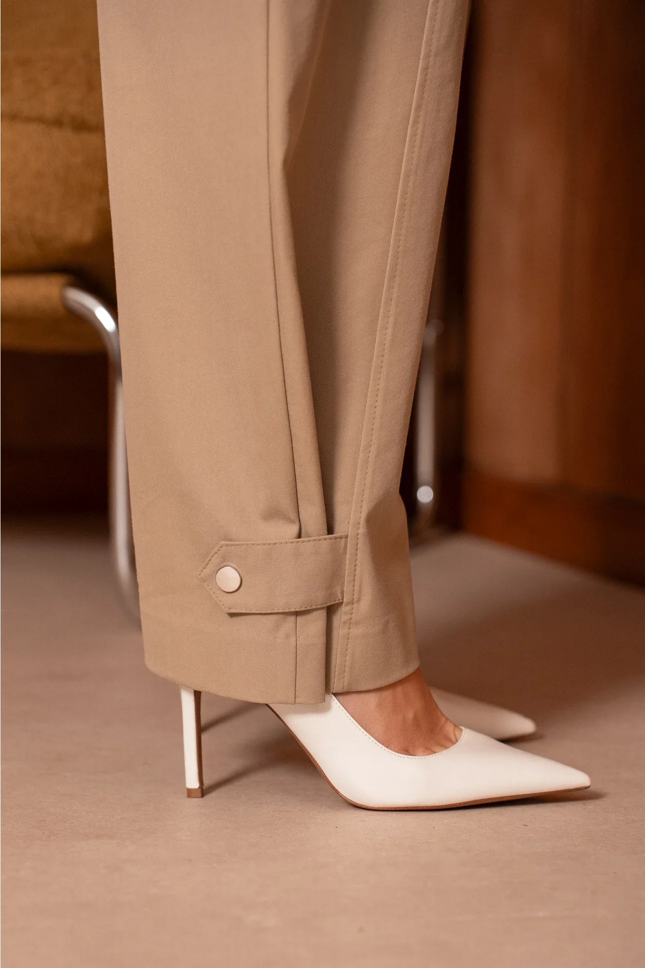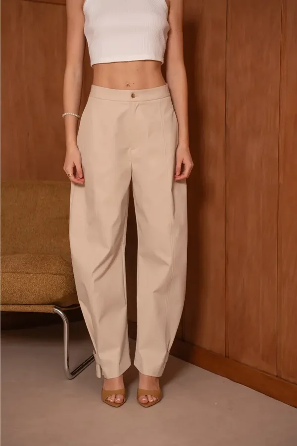 volume gevormd door diepe plooien langs het been en minimalistische afwerking inclusief paspelzakken aan de achterzijde.
